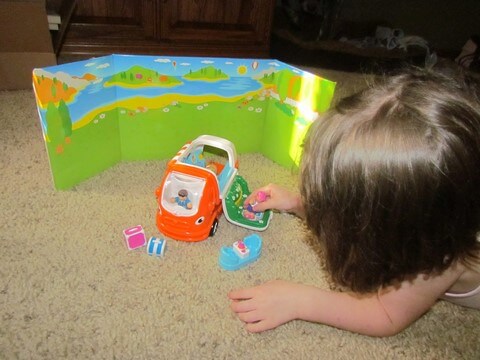 When we finally removed all the pieces from the box, we found that the background was removable as well and we decided it would make a great addition to our pretend play time. So I helped Lydia set it up and pretended that she and her Casey Camper Van were going on vacation! All of the parts are child friendly, and can all fit inside the camper for storing. When the Camper Van is on a smooth surface (it also worked on our carpet but not as fast) it can be pushed and will roll along the floor. It reminds me of some fun cars my brother had as a kid, that you "rev up" the engine by pushing the wheels several times, then let it go and it rolls/moves!